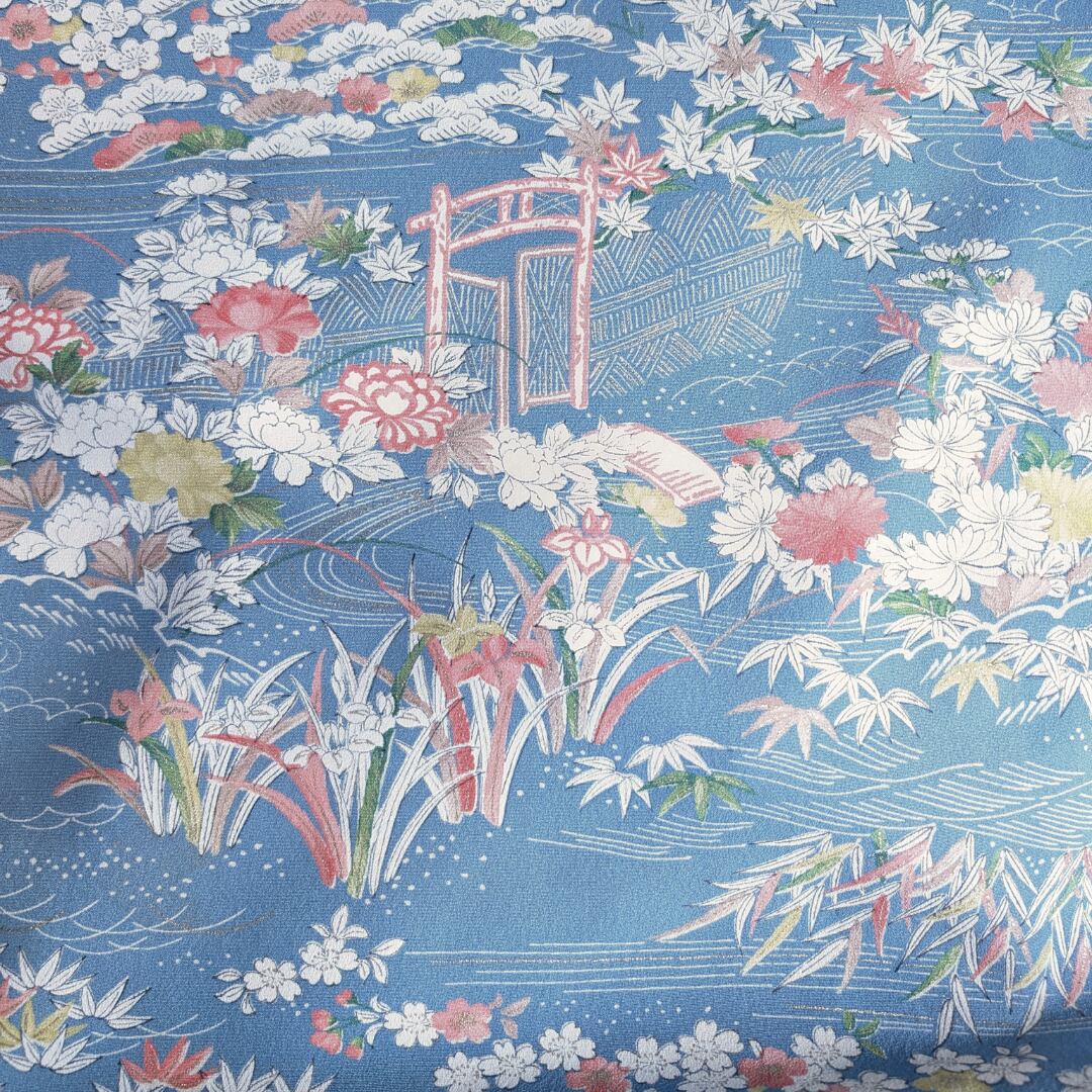 This exquisite kimono fabric beautifully captures the natural motifs representing Japan's four seasons. The gentle blue background is adorned with elegant designs of cherry blossoms, chrysanthemums, and bamboo, adding a refined and tranquil touch to any creation. Subtle highlights of gold and silver dye are used to accentuate details like flower stamens and leaf veins. While not overly flashy, these touches catch the light as the fabric moves, creating a delicate sparkle that enhances the fabric's elegance.