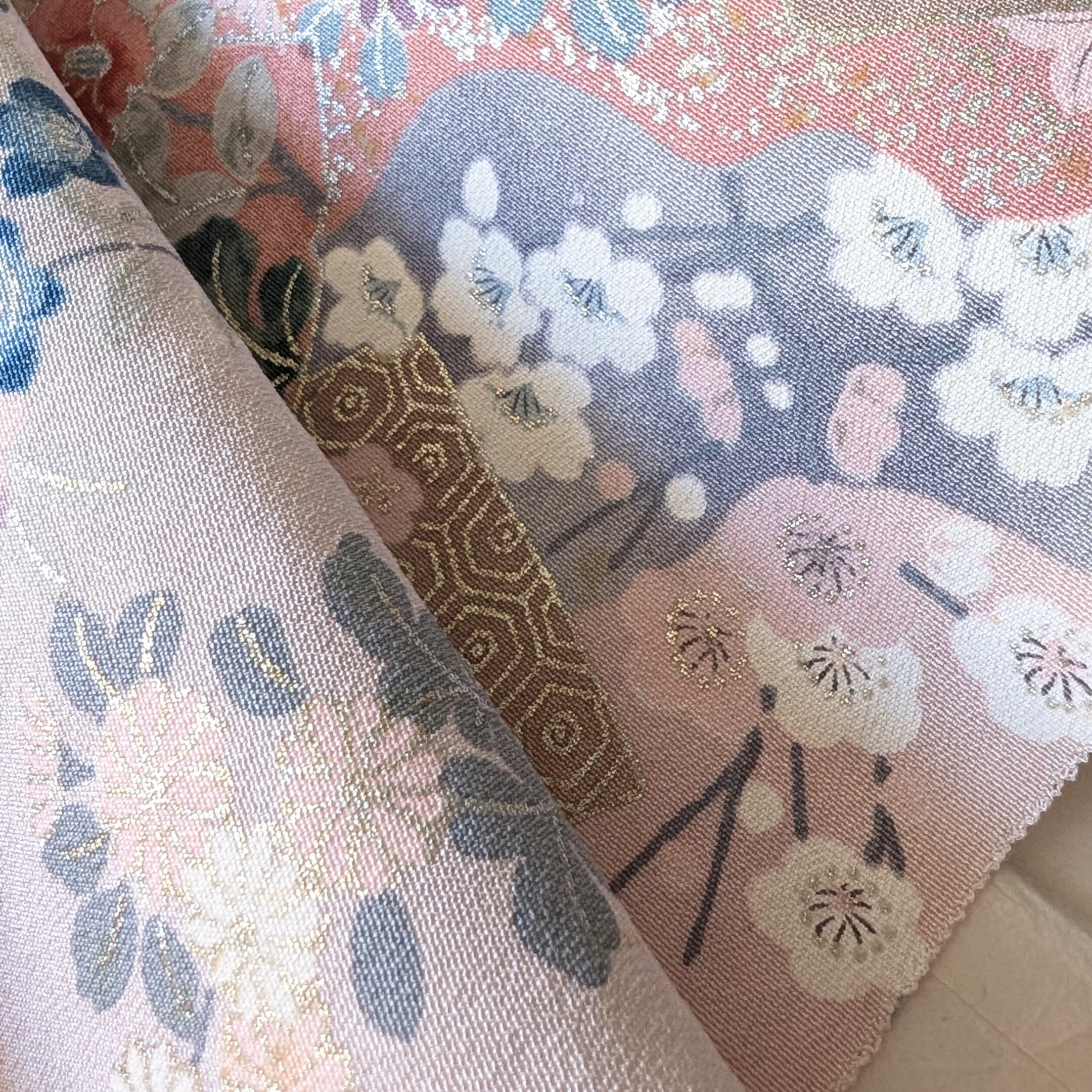 This kimono fabric harmonizes the soft glow of spring with delicate hues of pink, lavender, and light orange, creating a beautifully balanced and elegant design. Its gentle colors evoke a sense of peace and nostalgia, making it truly captivating.